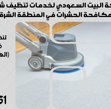 "نحن في شركة البيت السعودي نقدم خدمات تنظيف شاملة ومتكاملة تشمل تنظيف الشقق، المنازل، الفلل، القصور، والمكاتب، بالإضافة إلى مكافحة الحشرات بأنواعها وعزل الخزانات والأسطح. نغطي جميع مدن المنطقة الشرقية مثل الدمام، الخبر، القطيف، الجبيل، رأس تنورة، النعيرية، بقيق، الأحساء (الهفوف والمبرز)، والظهران. تواصل معنا الآن لخدمة احترافية بأعلى معايير الجودة."