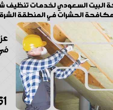 "نحن في شركة البيت السعودي نقدم خدمات تنظيف شاملة ومتكاملة تشمل تنظيف الشقق، المنازل، الفلل، القصور، والمكاتب، بالإضافة إلى مكافحة الحشرات بأنواعها وعزل الخزانات والأسطح. نغطي جميع مدن المنطقة الشرقية مثل الدمام، الخبر، القطيف، الجبيل، رأس تنورة، النعيرية، بقيق، الأحساء (الهفوف والمبرز)، والظهران. تواصل معنا الآن لخدمة احترافية بأعلى معايير الجودة."