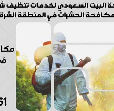 "نحن في شركة البيت السعودي نقدم خدمات تنظيف شاملة ومتكاملة تشمل تنظيف الشقق، المنازل، الفلل، القصور، والمكاتب، بالإضافة إلى مكافحة الحشرات بأنواعها وعزل الخزانات والأسطح. نغطي جميع مدن المنطقة الشرقية مثل الدمام، الخبر، القطيف، الجبيل، رأس تنورة، النعيرية، بقيق، الأحساء (الهفوف والمبرز)، والظهران. تواصل معنا الآن لخدمة احترافية بأعلى معايير الجودة."