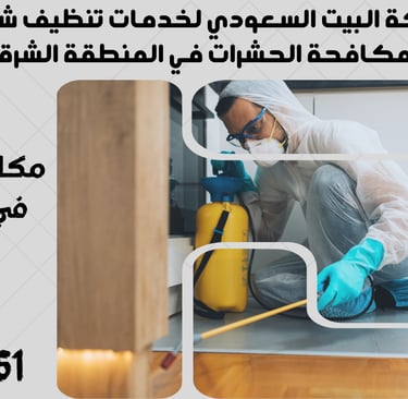 "نحن في شركة البيت السعودي نقدم خدمات تنظيف شاملة ومتكاملة تشمل تنظيف الشقق، المنازل، الفلل، القصور، والمكاتب، بالإضافة إلى مكافحة الحشرات بأنواعها وعزل الخزانات والأسطح. نغطي جميع مدن المنطقة الشرقية مثل الدمام، الخبر، القطيف، الجبيل، رأس تنورة، النعيرية، بقيق، الأحساء (الهفوف والمبرز)، والظهران. تواصل معنا الآن لخدمة احترافية بأعلى معايير الجودة."