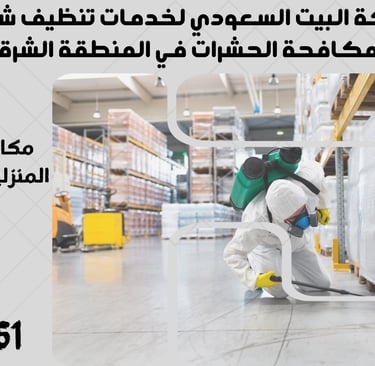 "نحن في شركة البيت السعودي نقدم خدمات تنظيف شاملة ومتكاملة تشمل تنظيف الشقق، المنازل، الفلل، القصور، والمكاتب، بالإضافة إلى مكافحة الحشرات بأنواعها وعزل الخزانات والأسطح. نغطي جميع مدن المنطقة الشرقية مثل الدمام، الخبر، القطيف، الجبيل، رأس تنورة، النعيرية، بقيق، الأحساء (الهفوف والمبرز)، والظهران. تواصل معنا الآن لخدمة احترافية بأعلى معايير الجودة."