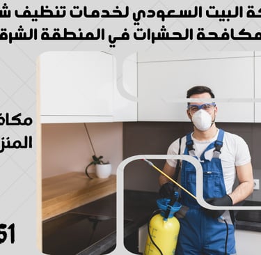 "نحن في شركة البيت السعودي نقدم خدمات تنظيف شاملة ومتكاملة تشمل تنظيف الشقق، المنازل، الفلل، القصور، والمكاتب، بالإضافة إلى مكافحة الحشرات بأنواعها وعزل الخزانات والأسطح. نغطي جميع مدن المنطقة الشرقية مثل الدمام، الخبر، القطيف، الجبيل، رأس تنورة، النعيرية، بقيق، الأحساء (الهفوف والمبرز)، والظهران. تواصل معنا الآن لخدمة احترافية بأعلى معايير الجودة."