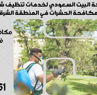 "نحن في شركة البيت السعودي نقدم خدمات تنظيف شاملة ومتكاملة تشمل تنظيف الشقق، المنازل، الفلل، القصور، والمكاتب، بالإضافة إلى مكافحة الحشرات بأنواعها وعزل الخزانات والأسطح. نغطي جميع مدن المنطقة الشرقية مثل الدمام، الخبر، القطيف، الجبيل، رأس تنورة، النعيرية، بقيق، الأحساء (الهفوف والمبرز)، والظهران. تواصل معنا الآن لخدمة احترافية بأعلى معايير الجودة."
