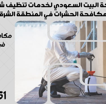 "نحن في شركة البيت السعودي نقدم خدمات تنظيف شاملة ومتكاملة تشمل تنظيف الشقق، المنازل، الفلل، القصور، والمكاتب، بالإضافة إلى مكافحة الحشرات بأنواعها وعزل الخزانات والأسطح. نغطي جميع مدن المنطقة الشرقية مثل الدمام، الخبر، القطيف، الجبيل، رأس تنورة، النعيرية، بقيق، الأحساء (الهفوف والمبرز)، والظهران. تواصل معنا الآن لخدمة احترافية بأعلى معايير الجودة."