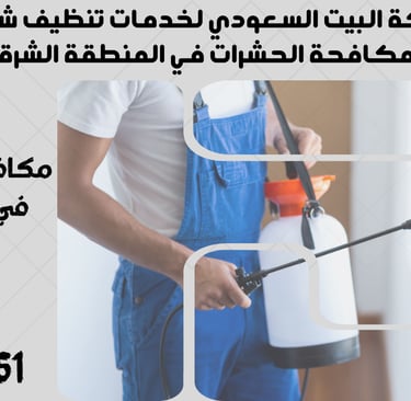 "نحن في شركة البيت السعودي نقدم خدمات تنظيف شاملة ومتكاملة تشمل تنظيف الشقق، المنازل، الفلل، القصور، والمكاتب، بالإضافة إلى مكافحة الحشرات بأنواعها وعزل الخزانات والأسطح. نغطي جميع مدن المنطقة الشرقية مثل الدمام، الخبر، القطيف، الجبيل، رأس تنورة، النعيرية، بقيق، الأحساء (الهفوف والمبرز)، والظهران. تواصل معنا الآن لخدمة احترافية بأعلى معايير الجودة."