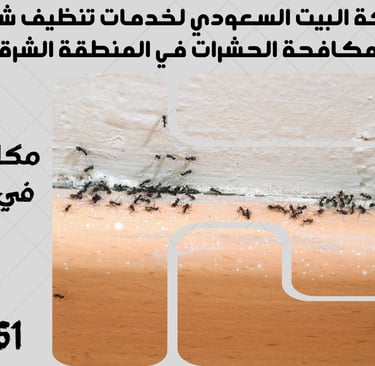 "نحن في شركة البيت السعودي نقدم خدمات تنظيف شاملة ومتكاملة تشمل تنظيف الشقق، المنازل، الفلل، القصور، والمكاتب، بالإضافة إلى مكافحة الحشرات بأنواعها وعزل الخزانات والأسطح. نغطي جميع مدن المنطقة الشرقية مثل الدمام، الخبر، القطيف، الجبيل، رأس تنورة، النعيرية، بقيق، الأحساء (الهفوف والمبرز)، والظهران. تواصل معنا الآن لخدمة احترافية بأعلى معايير الجودة."