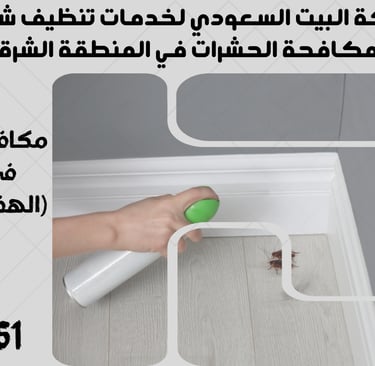 "نحن في شركة البيت السعودي نقدم خدمات تنظيف شاملة ومتكاملة تشمل تنظيف الشقق، المنازل، الفلل، القصور، والمكاتب، بالإضافة إلى مكافحة الحشرات بأنواعها وعزل الخزانات والأسطح. نغطي جميع مدن المنطقة الشرقية مثل الدمام، الخبر، القطيف، الجبيل، رأس تنورة، النعيرية، بقيق، الأحساء (الهفوف والمبرز)، والظهران. تواصل معنا الآن لخدمة احترافية بأعلى معايير الجودة."