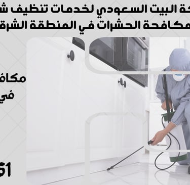 "نحن في شركة البيت السعودي نقدم خدمات تنظيف شاملة ومتكاملة تشمل تنظيف الشقق، المنازل، الفلل، القصور، والمكاتب، بالإضافة إلى مكافحة الحشرات بأنواعها وعزل الخزانات والأسطح. نغطي جميع مدن المنطقة الشرقية مثل الدمام، الخبر، القطيف، الجبيل، رأس تنورة، النعيرية، بقيق، الأحساء (الهفوف والمبرز)، والظهران. تواصل معنا الآن لخدمة احترافية بأعلى معايير الجودة."