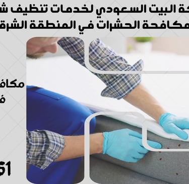 "نحن في شركة البيت السعودي نقدم خدمات تنظيف شاملة ومتكاملة تشمل تنظيف الشقق، المنازل، الفلل، القصور، والمكاتب، بالإضافة إلى مكافحة الحشرات بأنواعها وعزل الخزانات والأسطح. نغطي جميع مدن المنطقة الشرقية مثل الدمام، الخبر، القطيف، الجبيل، رأس تنورة، النعيرية، بقيق، الأحساء (الهفوف والمبرز)، والظهران. تواصل معنا الآن لخدمة احترافية بأعلى معايير الجودة."