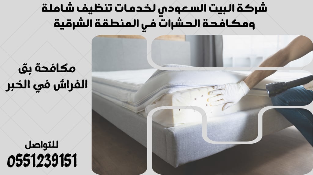 إذا كنت تعاني من مشكلة بق الفراش في الخبر، فإن شركة البيت السعودي هي الحل المثالي لك. تقدم الشركة خدمات متخصصة في مكافحة هذه الآفة، بأساليب فعالة وآمنة تضمن لك الراحة في منزلك. يمتلك فريق العمل في الشركة خبرة واسعة في التعامل مع بق الفراش، حيث يستخدمون تقنيات حديثة ومواد آمنة للحفاظ على صحة الأسرة والبيئة. لا تتردد في الاتصال بشركة البيت السعودي على الرقم 0551239151 للحصول على استشارة مجانية وعرض أسعار يناسب احتياجاتك. اجعل منزلك خالياً من بق الفراش واستمتع بنوم هانئ من دون قلق.