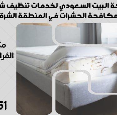 "نحن في شركة البيت السعودي نقدم خدمات تنظيف شاملة ومتكاملة تشمل تنظيف الشقق، المنازل، الفلل، القصور، والمكاتب، بالإضافة إلى مكافحة الحشرات بأنواعها وعزل الخزانات والأسطح. نغطي جميع مدن المنطقة الشرقية مثل الدمام، الخبر، القطيف، الجبيل، رأس تنورة، النعيرية، بقيق، الأحساء (الهفوف والمبرز)، والظهران. تواصل معنا الآن لخدمة احترافية بأعلى معايير الجودة."