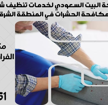 "نحن في شركة البيت السعودي نقدم خدمات تنظيف شاملة ومتكاملة تشمل تنظيف الشقق، المنازل، الفلل، القصور، والمكاتب، بالإضافة إلى مكافحة الحشرات بأنواعها وعزل الخزانات والأسطح. نغطي جميع مدن المنطقة الشرقية مثل الدمام، الخبر، القطيف، الجبيل، رأس تنورة، النعيرية، بقيق، الأحساء (الهفوف والمبرز)، والظهران. تواصل معنا الآن لخدمة احترافية بأعلى معايير الجودة."