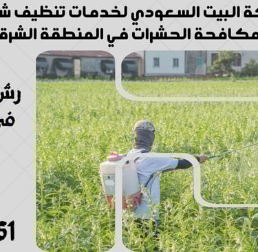 "نحن في شركة البيت السعودي نقدم خدمات تنظيف شاملة ومتكاملة تشمل تنظيف الشقق، المنازل، الفلل، القصور، والمكاتب، بالإضافة إلى مكافحة الحشرات بأنواعها وعزل الخزانات والأسطح. نغطي جميع مدن المنطقة الشرقية مثل الدمام، الخبر، القطيف، الجبيل، رأس تنورة، النعيرية، بقيق، الأحساء (الهفوف والمبرز)، والظهران. تواصل معنا الآن لخدمة احترافية بأعلى معايير الجودة."