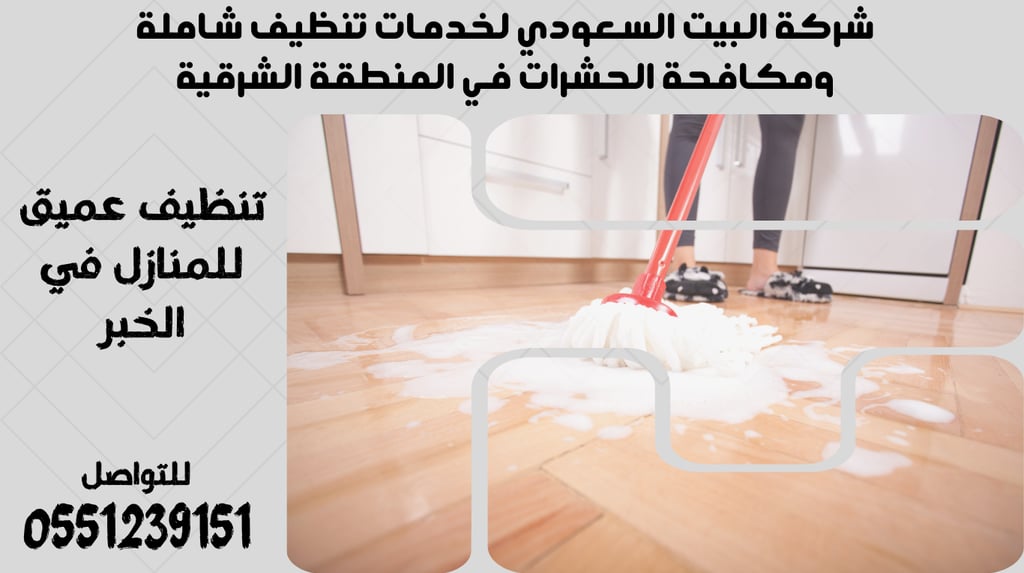 لا تدع الأوساخ والبقع المتراكمة تؤثر على مظهر منزلك أو راحتك. اتصل الآن بـ شركة البيت السعودي على الرقم 0551239151 لحجز خدمة التنظيف العميق للمنازل في الخبر واستمتع بنتائج مذهلة تضمن لك الراحة والهدوء في منزلك.