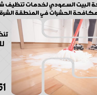 "نحن في شركة البيت السعودي نقدم خدمات تنظيف شاملة ومتكاملة تشمل تنظيف الشقق، المنازل، الفلل، القصور، والمكاتب، بالإضافة إلى مكافحة الحشرات بأنواعها وعزل الخزانات والأسطح. نغطي جميع مدن المنطقة الشرقية مثل الدمام، الخبر، القطيف، الجبيل، رأس تنورة، النعيرية، بقيق، الأحساء (الهفوف والمبرز)، والظهران. تواصل معنا الآن لخدمة احترافية بأعلى معايير الجودة."