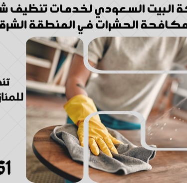 "نحن في شركة البيت السعودي نقدم خدمات تنظيف شاملة ومتكاملة تشمل تنظيف الشقق، المنازل، الفلل، القصور، والمكاتب، بالإضافة إلى مكافحة الحشرات بأنواعها وعزل الخزانات والأسطح. نغطي جميع مدن المنطقة الشرقية مثل الدمام، الخبر، القطيف، الجبيل، رأس تنورة، النعيرية، بقيق، الأحساء (الهفوف والمبرز)، والظهران. تواصل معنا الآن لخدمة احترافية بأعلى معايير الجودة."