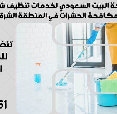 "نحن في شركة البيت السعودي نقدم خدمات تنظيف شاملة ومتكاملة تشمل تنظيف الشقق، المنازل، الفلل، القصور، والمكاتب، بالإضافة إلى مكافحة الحشرات بأنواعها وعزل الخزانات والأسطح. نغطي جميع مدن المنطقة الشرقية مثل الدمام، الخبر، القطيف، الجبيل، رأس تنورة، النعيرية، بقيق، الأحساء (الهفوف والمبرز)، والظهران. تواصل معنا الآن لخدمة احترافية بأعلى معايير الجودة."