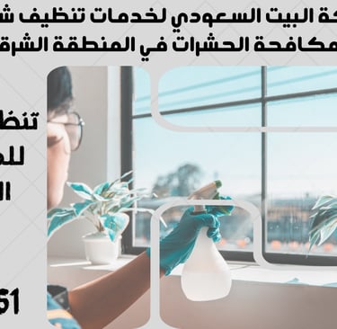 "نحن في شركة البيت السعودي نقدم خدمات تنظيف شاملة ومتكاملة تشمل تنظيف الشقق، المنازل، الفلل، القصور، والمكاتب، بالإضافة إلى مكافحة الحشرات بأنواعها وعزل الخزانات والأسطح. نغطي جميع مدن المنطقة الشرقية مثل الدمام، الخبر، القطيف، الجبيل، رأس تنورة، النعيرية، بقيق، الأحساء (الهفوف والمبرز)، والظهران. تواصل معنا الآن لخدمة احترافية بأعلى معايير الجودة."