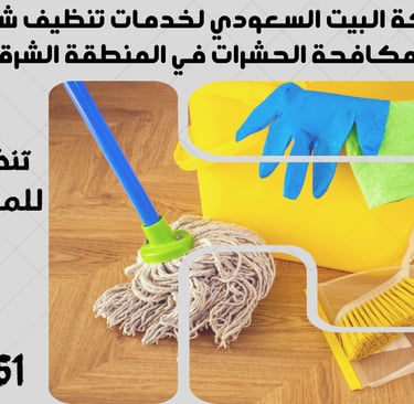 "نحن في شركة البيت السعودي نقدم خدمات تنظيف شاملة ومتكاملة تشمل تنظيف الشقق، المنازل، الفلل، القصور، والمكاتب، بالإضافة إلى مكافحة الحشرات بأنواعها وعزل الخزانات والأسطح. نغطي جميع مدن المنطقة الشرقية مثل الدمام، الخبر، القطيف، الجبيل، رأس تنورة، النعيرية، بقيق، الأحساء (الهفوف والمبرز)، والظهران. تواصل معنا الآن لخدمة احترافية بأعلى معايير الجودة."