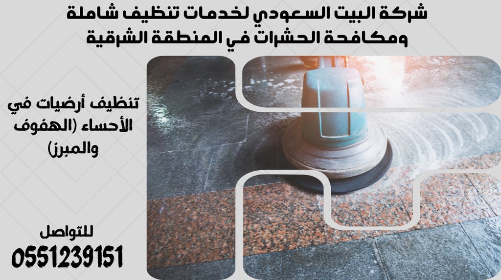 لا تدع الغبار والبقع تؤثر على جمال أرضيات منزلك أو مكتبك في الأحساء. احجز خدمات شركة البيت السعودي لتنظيف الأرضيات في الهفوف والمبرز اليوم عبر الاتصال على 0551239151.