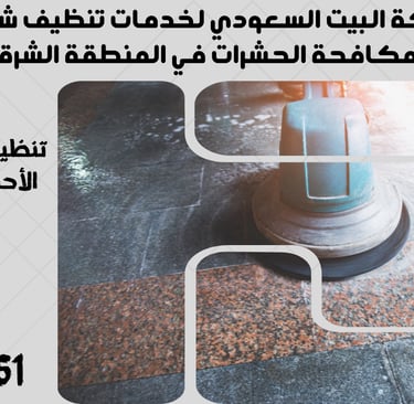 "نحن في شركة البيت السعودي نقدم خدمات تنظيف شاملة ومتكاملة تشمل تنظيف الشقق، المنازل، الفلل، القصور، والمكاتب، بالإضافة إلى مكافحة الحشرات بأنواعها وعزل الخزانات والأسطح. نغطي جميع مدن المنطقة الشرقية مثل الدمام، الخبر، القطيف، الجبيل، رأس تنورة، النعيرية، بقيق، الأحساء (الهفوف والمبرز)، والظهران. تواصل معنا الآن لخدمة احترافية بأعلى معايير الجودة."