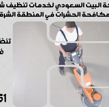 "نحن في شركة البيت السعودي نقدم خدمات تنظيف شاملة ومتكاملة تشمل تنظيف الشقق، المنازل، الفلل، القصور، والمكاتب، بالإضافة إلى مكافحة الحشرات بأنواعها وعزل الخزانات والأسطح. نغطي جميع مدن المنطقة الشرقية مثل الدمام، الخبر، القطيف، الجبيل، رأس تنورة، النعيرية، بقيق، الأحساء (الهفوف والمبرز)، والظهران. تواصل معنا الآن لخدمة احترافية بأعلى معايير الجودة."