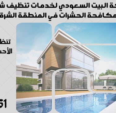 "نحن في شركة البيت السعودي نقدم خدمات تنظيف شاملة ومتكاملة تشمل تنظيف الشقق، المنازل، الفلل، القصور، والمكاتب، بالإضافة إلى مكافحة الحشرات بأنواعها وعزل الخزانات والأسطح. نغطي جميع مدن المنطقة الشرقية مثل الدمام، الخبر، القطيف، الجبيل، رأس تنورة، النعيرية، بقيق، الأحساء (الهفوف والمبرز)، والظهران. تواصل معنا الآن لخدمة احترافية بأعلى معايير الجودة."