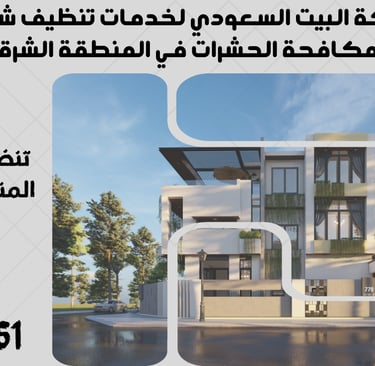 "نحن في شركة البيت السعودي نقدم خدمات تنظيف شاملة ومتكاملة تشمل تنظيف الشقق، المنازل، الفلل، القصور، والمكاتب، بالإضافة إلى مكافحة الحشرات بأنواعها وعزل الخزانات والأسطح. نغطي جميع مدن المنطقة الشرقية مثل الدمام، الخبر، القطيف، الجبيل، رأس تنورة، النعيرية، بقيق، الأحساء (الهفوف والمبرز)، والظهران. تواصل معنا الآن لخدمة احترافية بأعلى معايير الجودة."