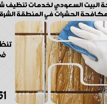 "نحن في شركة البيت السعودي نقدم خدمات تنظيف شاملة ومتكاملة تشمل تنظيف الشقق، المنازل، الفلل، القصور، والمكاتب، بالإضافة إلى مكافحة الحشرات بأنواعها وعزل الخزانات والأسطح. نغطي جميع مدن المنطقة الشرقية مثل الدمام، الخبر، القطيف، الجبيل، رأس تنورة، النعيرية، بقيق، الأحساء (الهفوف والمبرز)، والظهران. تواصل معنا الآن لخدمة احترافية بأعلى معايير الجودة."