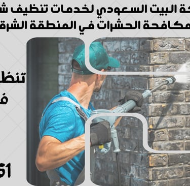 "نحن في شركة البيت السعودي نقدم خدمات تنظيف شاملة ومتكاملة تشمل تنظيف الشقق، المنازل، الفلل، القصور، والمكاتب، بالإضافة إلى مكافحة الحشرات بأنواعها وعزل الخزانات والأسطح. نغطي جميع مدن المنطقة الشرقية مثل الدمام، الخبر، القطيف، الجبيل، رأس تنورة، النعيرية، بقيق، الأحساء (الهفوف والمبرز)، والظهران. تواصل معنا الآن لخدمة احترافية بأعلى معايير الجودة."
