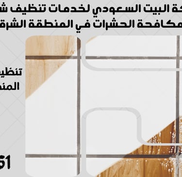 "نحن في شركة البيت السعودي نقدم خدمات تنظيف شاملة ومتكاملة تشمل تنظيف الشقق، المنازل، الفلل، القصور، والمكاتب، بالإضافة إلى مكافحة الحشرات بأنواعها وعزل الخزانات والأسطح. نغطي جميع مدن المنطقة الشرقية مثل الدمام، الخبر، القطيف، الجبيل، رأس تنورة، النعيرية، بقيق، الأحساء (الهفوف والمبرز)، والظهران. تواصل معنا الآن لخدمة احترافية بأعلى معايير الجودة."