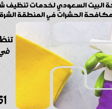 "نحن في شركة البيت السعودي نقدم خدمات تنظيف شاملة ومتكاملة تشمل تنظيف الشقق، المنازل، الفلل، القصور، والمكاتب، بالإضافة إلى مكافحة الحشرات بأنواعها وعزل الخزانات والأسطح. نغطي جميع مدن المنطقة الشرقية مثل الدمام، الخبر، القطيف، الجبيل، رأس تنورة، النعيرية، بقيق، الأحساء (الهفوف والمبرز)، والظهران. تواصل معنا الآن لخدمة احترافية بأعلى معايير الجودة."
