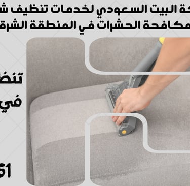 "نحن في شركة البيت السعودي نقدم خدمات تنظيف شاملة ومتكاملة تشمل تنظيف الشقق، المنازل، الفلل، القصور، والمكاتب، بالإضافة إلى مكافحة الحشرات بأنواعها وعزل الخزانات والأسطح. نغطي جميع مدن المنطقة الشرقية مثل الدمام، الخبر، القطيف، الجبيل، رأس تنورة، النعيرية، بقيق، الأحساء (الهفوف والمبرز)، والظهران. تواصل معنا الآن لخدمة احترافية بأعلى معايير الجودة."