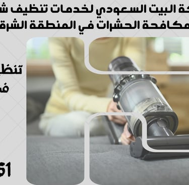 "نحن في شركة البيت السعودي نقدم خدمات تنظيف شاملة ومتكاملة تشمل تنظيف الشقق، المنازل، الفلل، القصور، والمكاتب، بالإضافة إلى مكافحة الحشرات بأنواعها وعزل الخزانات والأسطح. نغطي جميع مدن المنطقة الشرقية مثل الدمام، الخبر، القطيف، الجبيل، رأس تنورة، النعيرية، بقيق، الأحساء (الهفوف والمبرز)، والظهران. تواصل معنا الآن لخدمة احترافية بأعلى معايير الجودة."