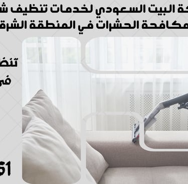 "نحن في شركة البيت السعودي نقدم خدمات تنظيف شاملة ومتكاملة تشمل تنظيف الشقق، المنازل، الفلل، القصور، والمكاتب، بالإضافة إلى مكافحة الحشرات بأنواعها وعزل الخزانات والأسطح. نغطي جميع مدن المنطقة الشرقية مثل الدمام، الخبر، القطيف، الجبيل، رأس تنورة، النعيرية، بقيق، الأحساء (الهفوف والمبرز)، والظهران. تواصل معنا الآن لخدمة احترافية بأعلى معايير الجودة."