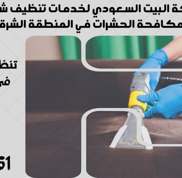 "نحن في شركة البيت السعودي نقدم خدمات تنظيف شاملة ومتكاملة تشمل تنظيف الشقق، المنازل، الفلل، القصور، والمكاتب، بالإضافة إلى مكافحة الحشرات بأنواعها وعزل الخزانات والأسطح. نغطي جميع مدن المنطقة الشرقية مثل الدمام، الخبر، القطيف، الجبيل، رأس تنورة، النعيرية، بقيق، الأحساء (الهفوف والمبرز)، والظهران. تواصل معنا الآن لخدمة احترافية بأعلى معايير الجودة."