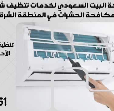 "نحن في شركة البيت السعودي نقدم خدمات تنظيف شاملة ومتكاملة تشمل تنظيف الشقق، المنازل، الفلل، القصور، والمكاتب، بالإضافة إلى مكافحة الحشرات بأنواعها وعزل الخزانات والأسطح. نغطي جميع مدن المنطقة الشرقية مثل الدمام، الخبر، القطيف، الجبيل، رأس تنورة، النعيرية، بقيق، الأحساء (الهفوف والمبرز)، والظهران. تواصل معنا الآن لخدمة احترافية بأعلى معايير الجودة."