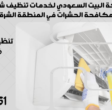 "نحن في شركة البيت السعودي نقدم خدمات تنظيف شاملة ومتكاملة تشمل تنظيف الشقق، المنازل، الفلل، القصور، والمكاتب، بالإضافة إلى مكافحة الحشرات بأنواعها وعزل الخزانات والأسطح. نغطي جميع مدن المنطقة الشرقية مثل الدمام، الخبر، القطيف، الجبيل، رأس تنورة، النعيرية، بقيق، الأحساء (الهفوف والمبرز)، والظهران. تواصل معنا الآن لخدمة احترافية بأعلى معايير الجودة."