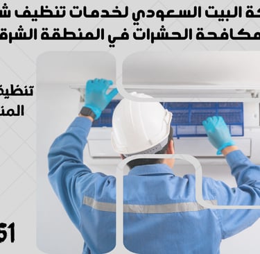 "نحن في شركة البيت السعودي نقدم خدمات تنظيف شاملة ومتكاملة تشمل تنظيف الشقق، المنازل، الفلل، القصور، والمكاتب، بالإضافة إلى مكافحة الحشرات بأنواعها وعزل الخزانات والأسطح. نغطي جميع مدن المنطقة الشرقية مثل الدمام، الخبر، القطيف، الجبيل، رأس تنورة، النعيرية، بقيق، الأحساء (الهفوف والمبرز)، والظهران. تواصل معنا الآن لخدمة احترافية بأعلى معايير الجودة."