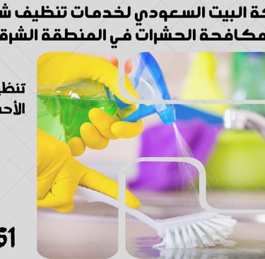 "نحن في شركة البيت السعودي نقدم خدمات تنظيف شاملة ومتكاملة تشمل تنظيف الشقق، المنازل، الفلل، القصور، والمكاتب، بالإضافة إلى مكافحة الحشرات بأنواعها وعزل الخزانات والأسطح. نغطي جميع مدن المنطقة الشرقية مثل الدمام، الخبر، القطيف، الجبيل، رأس تنورة، النعيرية، بقيق، الأحساء (الهفوف والمبرز)، والظهران. تواصل معنا الآن لخدمة احترافية بأعلى معايير الجودة."