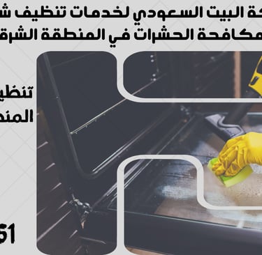 "نحن في شركة البيت السعودي نقدم خدمات تنظيف شاملة ومتكاملة تشمل تنظيف الشقق، المنازل، الفلل، القصور، والمكاتب، بالإضافة إلى مكافحة الحشرات بأنواعها وعزل الخزانات والأسطح. نغطي جميع مدن المنطقة الشرقية مثل الدمام، الخبر، القطيف، الجبيل، رأس تنورة، النعيرية، بقيق، الأحساء (الهفوف والمبرز)، والظهران. تواصل معنا الآن لخدمة احترافية بأعلى معايير الجودة."