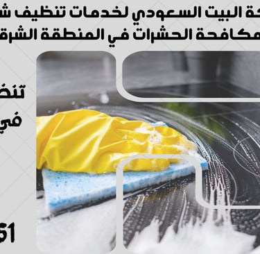 "نحن في شركة البيت السعودي نقدم خدمات تنظيف شاملة ومتكاملة تشمل تنظيف الشقق، المنازل، الفلل، القصور، والمكاتب، بالإضافة إلى مكافحة الحشرات بأنواعها وعزل الخزانات والأسطح. نغطي جميع مدن المنطقة الشرقية مثل الدمام، الخبر، القطيف، الجبيل، رأس تنورة، النعيرية، بقيق، الأحساء (الهفوف والمبرز)، والظهران. تواصل معنا الآن لخدمة احترافية بأعلى معايير الجودة."