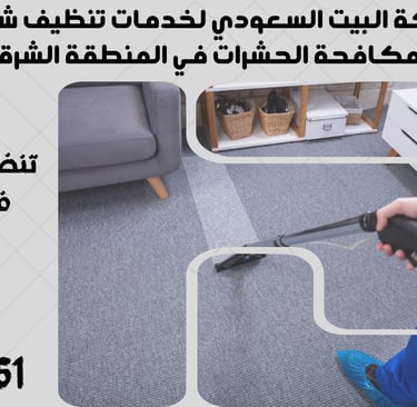 "نحن في شركة البيت السعودي نقدم خدمات تنظيف شاملة ومتكاملة تشمل تنظيف الشقق، المنازل، الفلل، القصور، والمكاتب، بالإضافة إلى مكافحة الحشرات بأنواعها وعزل الخزانات والأسطح. نغطي جميع مدن المنطقة الشرقية مثل الدمام، الخبر، القطيف، الجبيل، رأس تنورة، النعيرية، بقيق، الأحساء (الهفوف والمبرز)، والظهران. تواصل معنا الآن لخدمة احترافية بأعلى معايير الجودة."