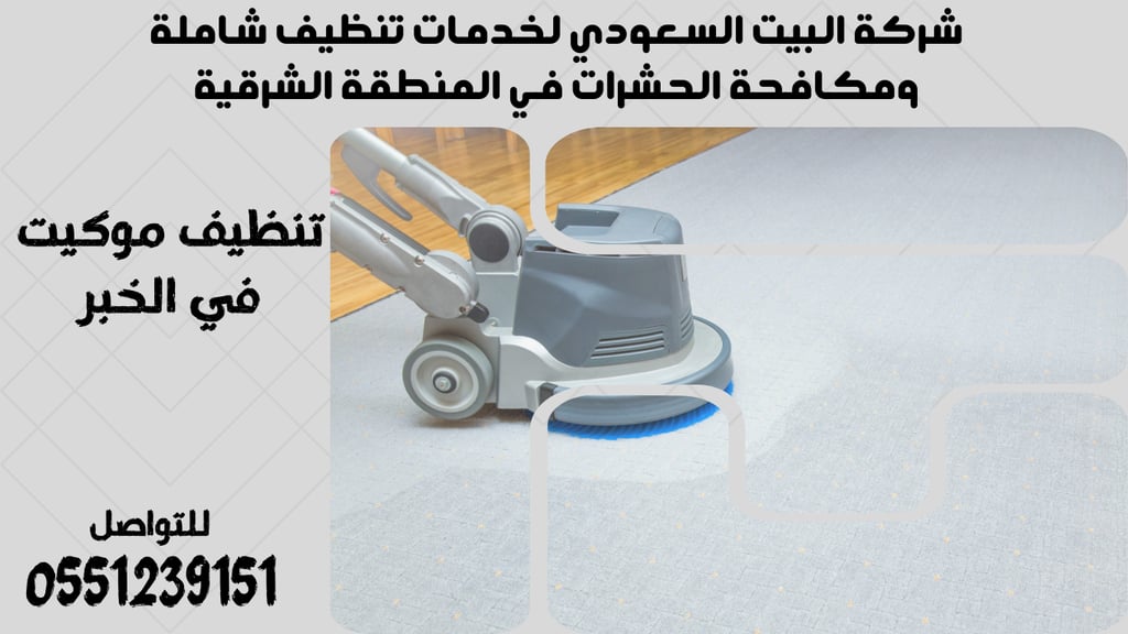 إذا كنت تبحث عن خدمة تنظيف موكيت في الخبر، فلا تتردد في التواصل مع شركة البيت السعودي، التي تقدم خدمات عالية الجودة بأسعار تنافسية. نحن نضمن لك تنظيفًا شاملًا واحترافيًا لموكيت منزلك أو مكتبك، باستخدام أحدث المعدات والمواد الآمنة على البيئة والصحة. يتكون فريقنا من خبراء مدربين على كيفية التعامل مع جميع أنواع الموكيت، مما يضمن لك نتائج ممتازة تدوم طويلاً. لا تنتظر أكثر، اتصل بنا على 0551239151 للحصول على استشارة مجانية أو لترتيب موعد تنظيف يناسب جدولك. اختر شركة البيت السعودي وتمتع بمساحات نظيفة وجميلة تدعوك للاسترخاء والراحة.