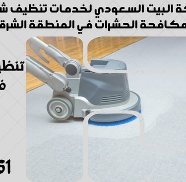 "نحن في شركة البيت السعودي نقدم خدمات تنظيف شاملة ومتكاملة تشمل تنظيف الشقق، المنازل، الفلل، القصور، والمكاتب، بالإضافة إلى مكافحة الحشرات بأنواعها وعزل الخزانات والأسطح. نغطي جميع مدن المنطقة الشرقية مثل الدمام، الخبر، القطيف، الجبيل، رأس تنورة، النعيرية، بقيق، الأحساء (الهفوف والمبرز)، والظهران. تواصل معنا الآن لخدمة احترافية بأعلى معايير الجودة."