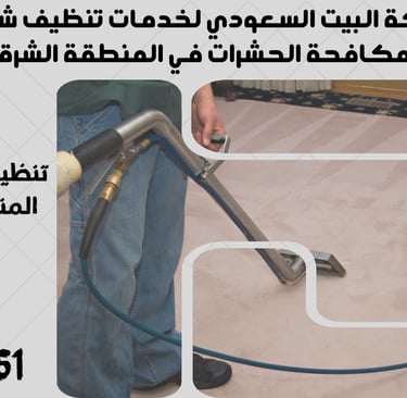 "نحن في شركة البيت السعودي نقدم خدمات تنظيف شاملة ومتكاملة تشمل تنظيف الشقق، المنازل، الفلل، القصور، والمكاتب، بالإضافة إلى مكافحة الحشرات بأنواعها وعزل الخزانات والأسطح. نغطي جميع مدن المنطقة الشرقية مثل الدمام، الخبر، القطيف، الجبيل، رأس تنورة، النعيرية، بقيق، الأحساء (الهفوف والمبرز)، والظهران. تواصل معنا الآن لخدمة احترافية بأعلى معايير الجودة."