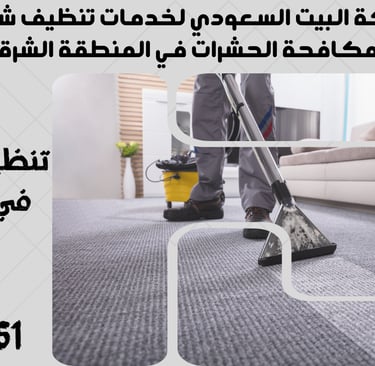 "نحن في شركة البيت السعودي نقدم خدمات تنظيف شاملة ومتكاملة تشمل تنظيف الشقق، المنازل، الفلل، القصور، والمكاتب، بالإضافة إلى مكافحة الحشرات بأنواعها وعزل الخزانات والأسطح. نغطي جميع مدن المنطقة الشرقية مثل الدمام، الخبر، القطيف، الجبيل، رأس تنورة، النعيرية، بقيق، الأحساء (الهفوف والمبرز)، والظهران. تواصل معنا الآن لخدمة احترافية بأعلى معايير الجودة."