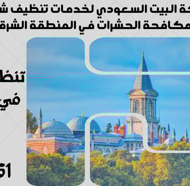"نحن في شركة البيت السعودي نقدم خدمات تنظيف شاملة ومتكاملة تشمل تنظيف الشقق، المنازل، الفلل، القصور، والمكاتب، بالإضافة إلى مكافحة الحشرات بأنواعها وعزل الخزانات والأسطح. نغطي جميع مدن المنطقة الشرقية مثل الدمام، الخبر، القطيف، الجبيل، رأس تنورة، النعيرية، بقيق، الأحساء (الهفوف والمبرز)، والظهران. تواصل معنا الآن لخدمة احترافية بأعلى معايير الجودة."