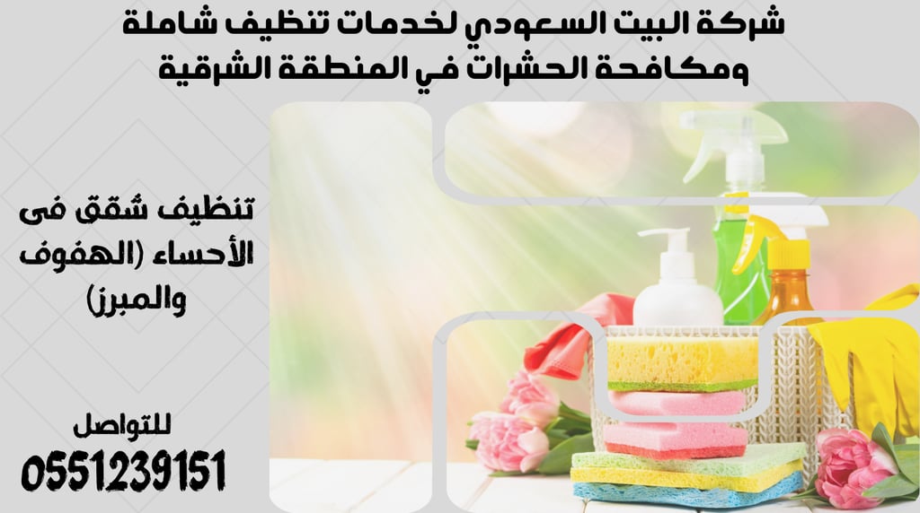 شركة البيت السعودي تقدم خدمة تنظيف شقق احترافية في الأحساء، تحديدًا في منطقتي الهفوف والمبرز. بخبرة تمتد لسنوات، نضمن لك تنظيفًا شاملاً لكل أركان شقتك باستخدام أفضل المواد والمعقمات لضمان السلامة والنظافة. فريقنا المدرب على أعلى مستوى يسعى لتلبية احتياجاتك ورغباتك، سواء كانت خدمات تنظيف منتظمة أو لمناسبات خاصة. نحن ندرك أهمية النظافة لصحة وسلامة الأسرة، لذلك نقدم خدماتنا بأسعار تنافسية ومواعيد مرنة تناسب جدولك. لا تتردد في الاتصال بنا على الرقم 0551239151 لترتيب موعد وتنظيف شقتك بأعلى جودة.
