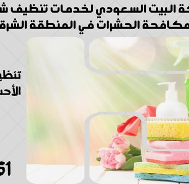 "نحن في شركة البيت السعودي نقدم خدمات تنظيف شاملة ومتكاملة تشمل تنظيف الشقق، المنازل، الفلل، القصور، والمكاتب، بالإضافة إلى مكافحة الحشرات بأنواعها وعزل الخزانات والأسطح. نغطي جميع مدن المنطقة الشرقية مثل الدمام، الخبر، القطيف، الجبيل، رأس تنورة، النعيرية، بقيق، الأحساء (الهفوف والمبرز)، والظهران. تواصل معنا الآن لخدمة احترافية بأعلى معايير الجودة."